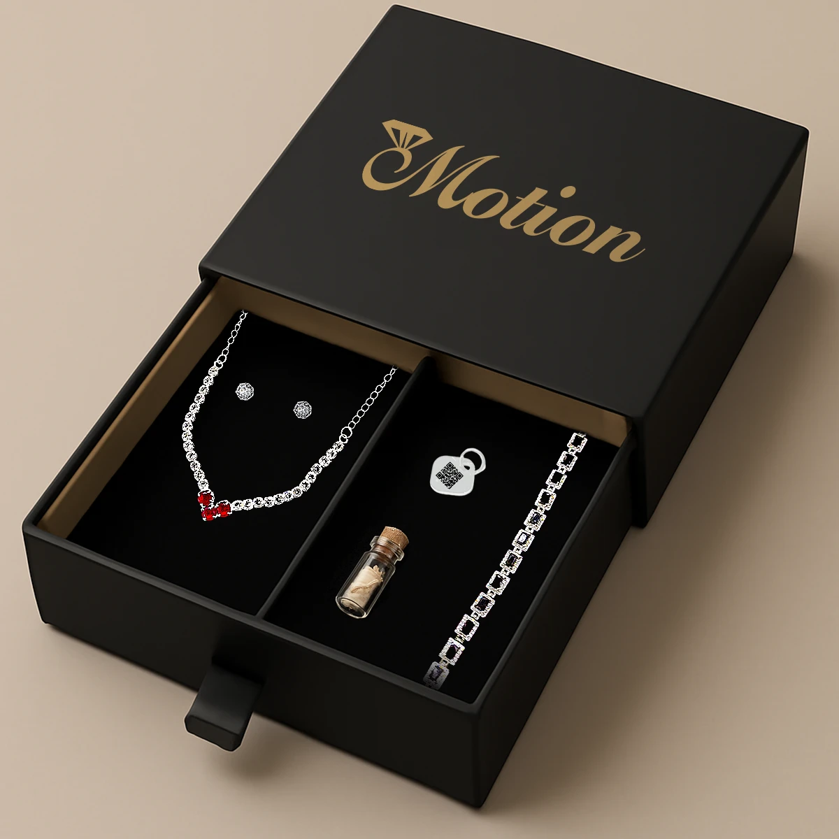 Delight your loved one with the Royal Box. Inside, you’ll find a necklace, bracelet, and ring, a tiny message bottle, and a QR code card carrying your personal words for someone special.